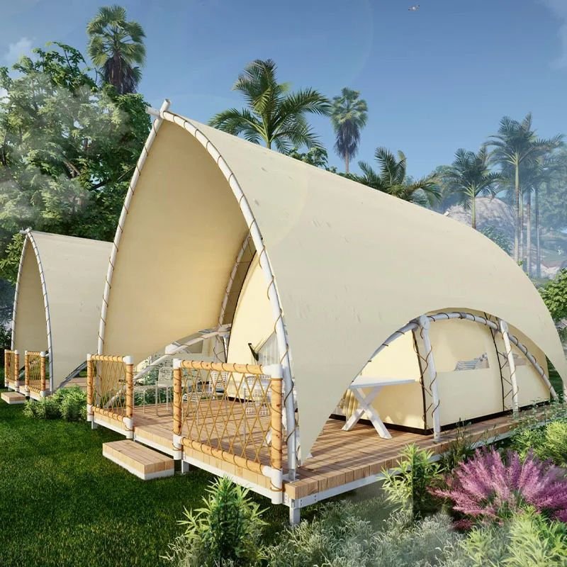 ₹450.00 ₹500.00 / Sq ft The typical cost estimate for fabric cottages in India ranges from ₹400 to ₹2,500 per square foot, depending on the structural design, materials, finishes, and customization level. Key Features: 1-Lightweight Structure: Tensile cottages use tensioned membranes made from materials like PTFE, PVC, or polyester over structural frames, resulting in minimal